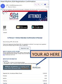 Increase your reach and awareness among #HRS2026 attendees prior to the meeting with your branding and message on the registration confirmation email deployments. More than 12,000 confirmation emails were sent to Heart Rhythm 2025 attendees as well as over 17,000 Registration Wallet emails.