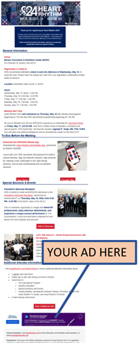 Deliver your message to Heart Rhythm 2026 attendees and industry representatives with premium placement on the HeartRhythm.com homepage and the Heart Rhythm 2026 Online Planner. Both platforms provide essential attendee access to meeting details, planning tools, and educational content.